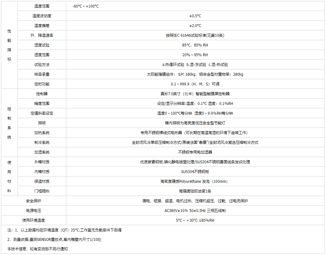 光伏濕凍試驗箱適用于光伏組件(太陽能電池板)做熱循環、濕凍循環、高溫高濕雙85試驗,以確認組件能否承受高溫高濕之后隨之的負溫度影響,以及對于溫度重復變化時引起的疲勞和熱失效,另外確定光伏組件曝露在高濕度下而產生的熱應力及能夠抵抗濕氣長期滲透的能力.是光伏組件行業必不可少的測試設備。
