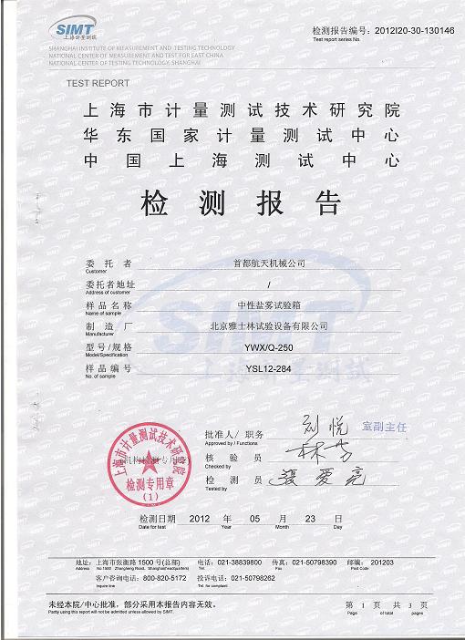 鹽霧腐蝕試驗箱檢測報告-上海計量院-首都航天