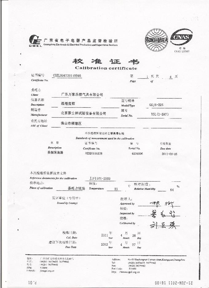 高低溫交變濕熱試驗箱校準證書-廣東檢驗所-萬家樂