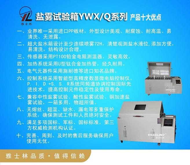 鹽霧腐蝕試驗箱為人工氣候環境“三防”(濕熱、鹽霧、霉菌)試驗設備之一,是模擬大氣中含鹽微小液滴所構成的彌散系統的設備。廣泛應用在電子、電工及汽車、摩托車、五金工具、化工等產品及零部件、金屬材料與制品的鍍、涂層等進行鹽霧試驗。市場規模巨大,競爭空前,雅士林YASELINE系列鹽霧試驗箱高起點、高質量、高服務,定位于中高端客戶群體,以其過硬的質量和完善的售后服務及良好的市場口碑贏得了中國航天、中國科學院、清華大學、北航、摩托羅拉、ABB、西門子、豐田汽車、中國船舶、北京現代汽車等一系列高端客戶群,其產品具有如下十大優點: