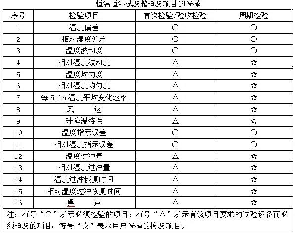恒溫恒濕試驗(yàn)箱首次檢驗(yàn)/驗(yàn)收檢驗(yàn)和周期檢驗(yàn)時(shí),若無(wú)其他規(guī)定,按下表選擇檢驗(yàn)項(xiàng)目。