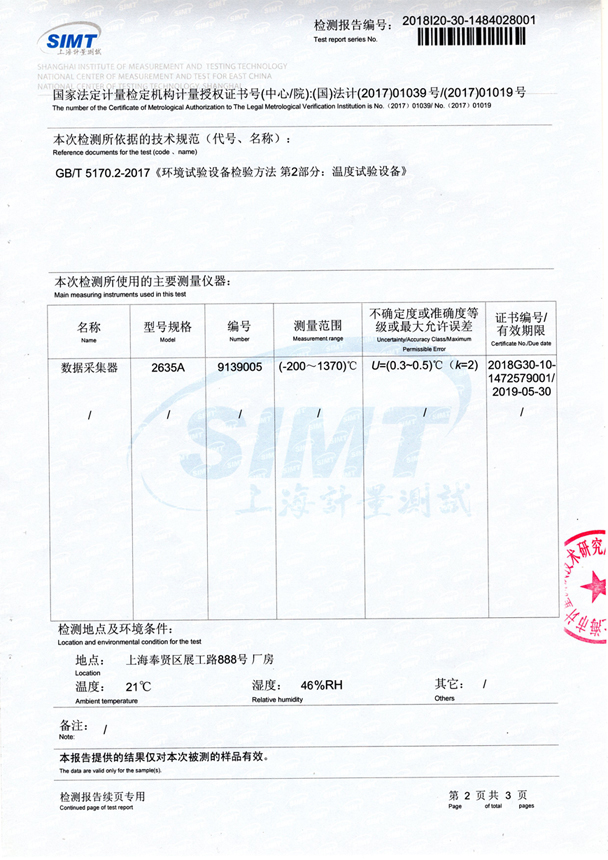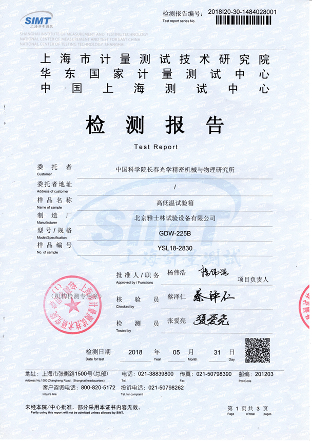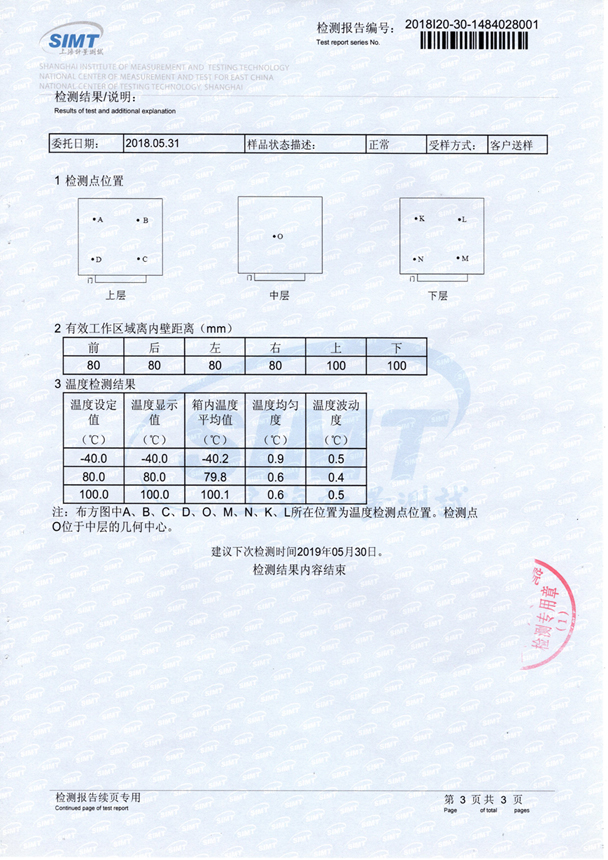高低溫試驗箱在首次投入使用前,應對可反映設備性能的相關參數進行詳細確認及測試,在日常使用中則應依據所使用的試驗方法進行對試驗參數的要求,需確認其性能是否滿足試驗參數的要求。更多的用戶會選擇由第三方檢測機構進行檢測,并出廠檢測報告,如下: